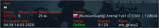 Играет на Counter Strike Global Offensive сервере. Страна: РоссияПервый раз замечен 09:11 19.02.2026