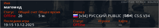 Играет на Counter Strike Source сервере. Страна: РоссияПервый раз замечен 18:45 13.12.2025