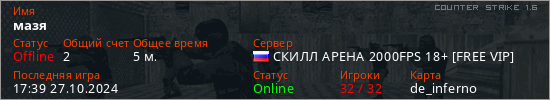 Играет на Counter Strike 1.6 сервере. Страна: РоссияПервый раз замечен 17:26 27.10.2024