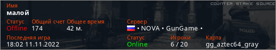 Играет на Counter Strike Source сервере. Страна: РоссияПервый раз замечен 19:20 21.10.2022