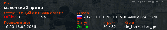 Играет на Counter Strike 1.6 сервере. Страна: РоссияПервый раз замечен 16:38 18.02.2026