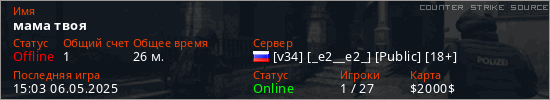 Играет на Counter Strike Source сервере. Страна: РоссияПервый раз замечен 15:39 20.02.2024