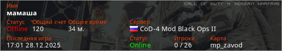 Играет на Call of Duty 4: Modern Warfare сервере. Страна: РоссияПервый раз замечен 13:02 06.04.2025