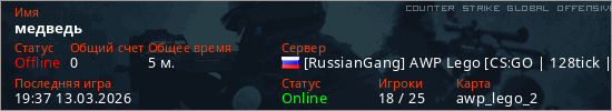 Играет на Counter Strike Global Offensive сервере. Страна: РоссияПервый раз замечен 19:26 13.03.2026