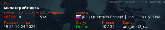 Играет на Counter Strike Global Offensive сервере. Страна: РоссияПервый раз замечен 19:49 16.04.2026