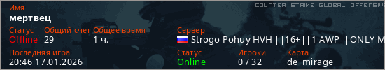 Играет на Counter Strike Global Offensive сервере. Страна: РоссияПервый раз замечен 20:23 27.12.2025