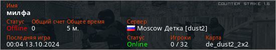 Играет на Counter Strike 1.6 сервере. Страна: РоссияПервый раз замечен 23:08 12.10.2024