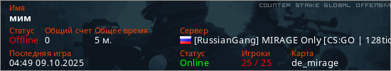 Играет на Counter Strike Global Offensive сервере. Страна: РоссияПервый раз замечен 02:15 09.10.2025