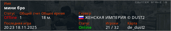 Играет на Counter Strike 1.6 сервере. Страна: РоссияПервый раз замечен 18:25 17.11.2025