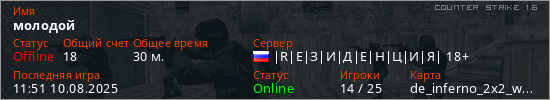 Последний раз был в сети 11:51 10.08.2025 Игрок с таким ником замечен на 31 сервере