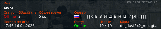 Играет на Counter Strike 1.6 сервере. Страна: РоссияПервый раз замечен 17:44 16.04.2026