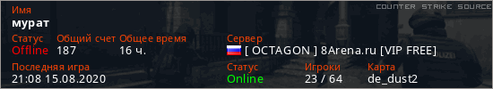 Играет на Counter Strike Source сервере. Страна: РоссияПервый раз замечен 18:21 08.07.2020