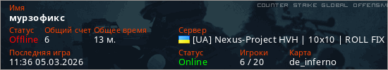 Играет на Counter Strike Global Offensive сервере. Страна: УкраинаПервый раз замечен 00:19 05.03.2026
