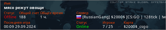 Играет на Counter Strike Global Offensive сервере. Страна: РоссияПервый раз замечен 20:44 09.05.2024
