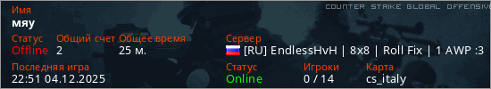 Играет на Counter Strike Global Offensive сервере. Страна: РоссияПервый раз замечен 21:45 23.09.2025