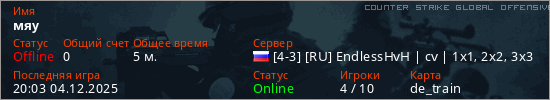 Играет на Counter Strike Global Offensive сервере. Страна: РоссияПервый раз замечен 20:01 04.12.2025