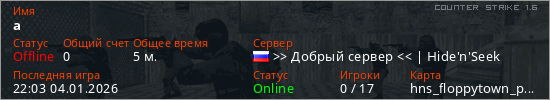 Играет на Counter Strike 1.6 сервере. Страна: РоссияПервый раз замечен 21:03 04.01.2026