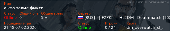 Играет на Half Life 2 DeathMatch сервере. Страна: РоссияПервый раз замечен 21:46 07.02.2026