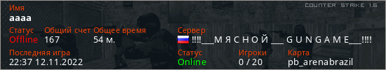 Играет на Counter Strike 1.6 сервере. Страна: РоссияПервый раз замечен 21:45 12.11.2022