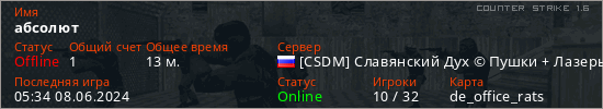 Играет на Counter Strike 1.6 сервере. Страна: РоссияПервый раз замечен 16:09 05.05.2024