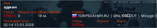 Играет на Counter Strike Global Offensive сервере. Страна: РоссияПервый раз замечен 22:42 09.03.2026