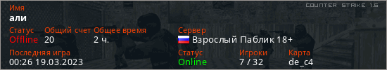 Последний раз был в сети 00:26 19.03.2023 Игрок с таким ником замечен на 18 серверах