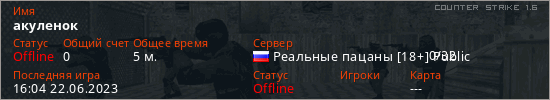 Играет на Counter Strike 1.6 сервере. Страна: РоссияПервый раз замечен 16:00 22.06.2023