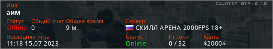 Играет на Counter Strike 1.6 сервере. Страна: РоссияПервый раз замечен 17:42 12.07.2023