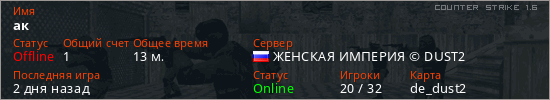 Играет на Counter Strike 1.6 сервере. Страна: РоссияПервый раз замечен 14:21 20.04.2026