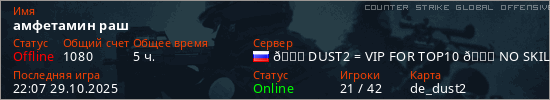 Играет на Counter Strike Global Offensive сервере. Страна: РоссияПервый раз замечен 18:30 22.09.2025