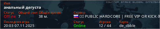 Играет на Counter Strike Global Offensive сервере. Страна: РоссияПервый раз замечен 20:39 19.09.2025
