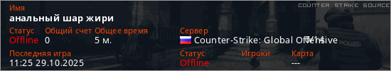 Играет на Counter Strike Source сервере. Страна: РоссияПервый раз замечен 11:22 29.10.2025