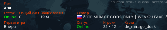 Играет на Counter Strike Global Offensive сервере. Страна: РоссияПервый раз замечен 08:30 07.02.2026