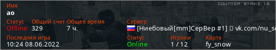 Играет на Counter Strike 1.6 сервере. Страна: РоссияПервый раз замечен 10:56 31.05.2022