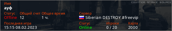Играет на Counter Strike Source сервере. Страна: РоссияПервый раз замечен 19:46 07.02.2023