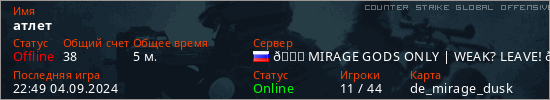 Играет на Counter Strike Global Offensive сервере. Страна: РоссияПервый раз замечен 22:27 04.09.2024
