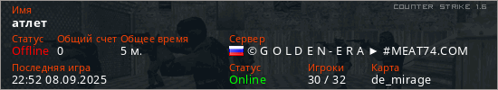 Играет на Counter Strike 1.6 сервере. Страна: РоссияПервый раз замечен 22:50 08.09.2025