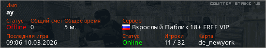 Играет на Counter Strike 1.6 сервере. Страна: РоссияПервый раз замечен 09:02 10.03.2026