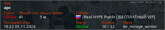 Играет на Counter Strike 1.6 сервере. Страна: РоссияПервый раз замечен 18:05 05.11.2024