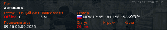 Играет на Counter Strike 1.6 сервере. Страна: РоссияПервый раз замечен 09:31 06.09.2025