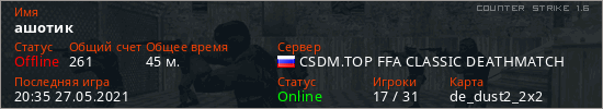 Последний раз был в сети 20:35 27.05.2021 Игрок с таким ником замечен на 7 серверах