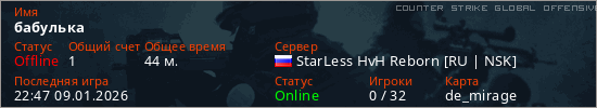 Играет на Counter Strike Global Offensive сервере. Страна: РоссияПервый раз замечен 00:59 26.12.2025