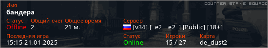 Играет на Counter Strike Source сервере. Страна: РоссияПервый раз замечен 18:04 17.01.2025