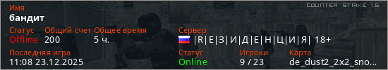 Последний раз был в сети 11:08 23.12.2025 Игрок с таким ником замечен на 13 серверах