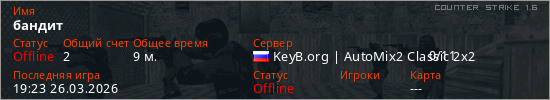 Играет на Counter Strike 1.6 сервере. Страна: РоссияПервый раз замечен 19:09 25.03.2026