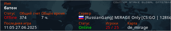 Играет на Counter Strike Global Offensive сервере. Страна: РоссияПервый раз замечен 19:49 25.11.2023