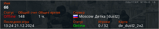 Последний раз был в сети 13:24 21.12.2024 Игрок с таким ником замечен на 19 серверах