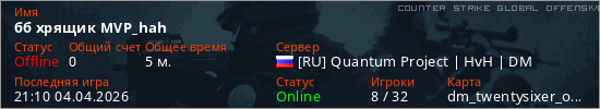 Играет на Counter Strike Global Offensive сервере. Страна: РоссияПервый раз замечен 21:08 04.04.2026