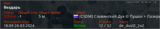 Играет на Counter Strike 1.6 сервере. Страна: РоссияПервый раз замечен 17:59 26.03.2024
