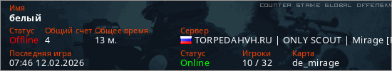 Играет на Counter Strike Global Offensive сервере. Страна: РоссияПервый раз замечен 06:20 12.02.2026